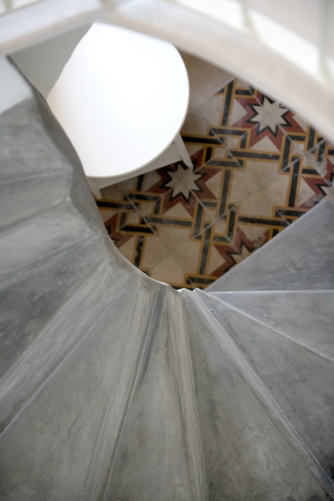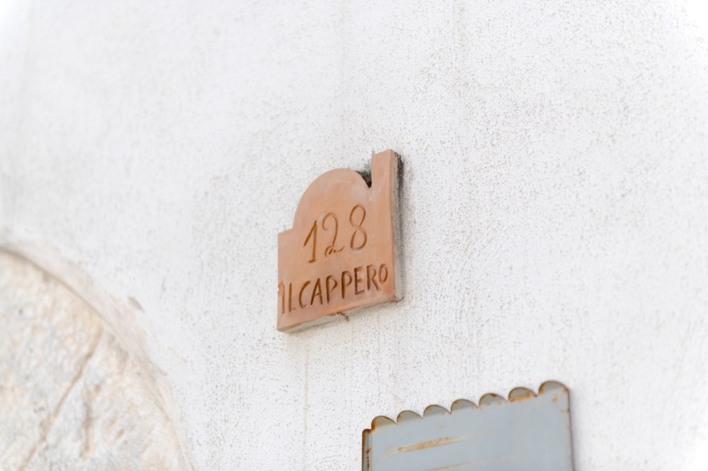 La saletta con ches longue guarda una piccola baia turchese e, dalla scala a chiocciola si scende nella sala da bagno scavata nella roccia.